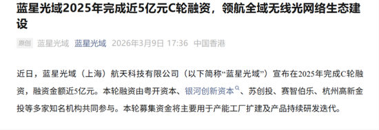 根据公司官微新闻,近日,蓝星光域(上海)航天科技有限公司宣布在2025年完成C轮融资,融资金额近5亿元。本轮融资由粤开资本、银河创新资本、苏创投、赛智伯乐、杭州高新金投等多家知名机构共同参与。本轮募集资金将主要用于产能工厂扩建及产品持续研发迭代。