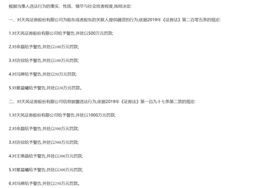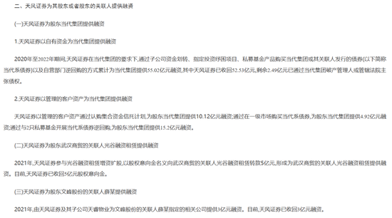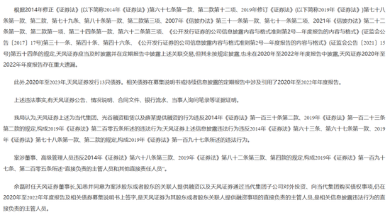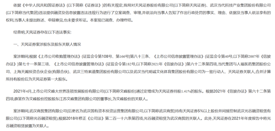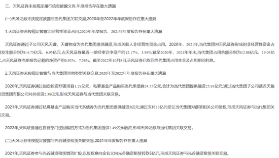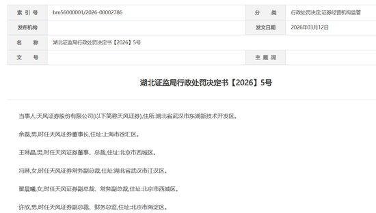 3月12日,湖北证监局公布对天风证券及5名责任人的行政处罚决定书。天风证券未按规定披露与当代集团关联交易,2020年至2022年年度报告存在重大遗漏,未按规定披露与光谷融资租赁关联交易,2021年年度报告存在重大遗漏,此外,2020年至2023年,天风证券发行13只债券。相关债券在募集说明书或持续信息披露的定期报告中涉及引用了2020年至2022年年度报告。天风证券被罚款1500万元,余磊(时任天风证券董事长)、王琳晶等5名责任人合计被罚款2130万元。