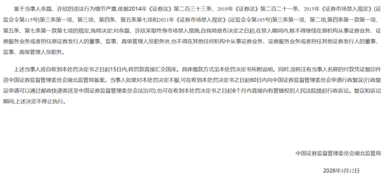 上述当事人应自收到本处罚决定书之日起15日内,将罚款直接汇交国库。具体缴款方式见本处罚决定书所附说明。同时,须将注有当事人名称的付款凭证复印件送中国证券监督管理委员会行政处罚委员会办公室及我局备案。当事人如果对本处罚决定不服,可在收到本处罚决定书之日起60日内向中国证券监督管理委员会申请行政复议(行政复议申请可以通过邮政快递寄送至中国证券监督管理委员会法治司),也可在收到本处罚决定书之日起6个月内直接向有管辖权的人民法院提起行政诉讼。复议和诉讼期间,上述决定不停止执行。