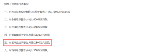 3月13日,福建证监局公布一份对天风证券股份有限公司总裁王琳晶先生的行政处罚决定书。经查明,天风证券及王琳晶存在以下违法事实:2021年12月31日,福建省泉州市中级人民法院作出《执行裁定书》,裁定将被执行人苏某旭、福建南安雄创投资中心(有限合伙)合计持有的41,372,005股永安林业股票及红利交付天风证券抵偿相关债务,并载明“上述财产权自本裁定送达申请执行人时起转移”。当日,天风证券作为申请执行人签收了上述《执行裁定书》,其持有的永安林业股票占永安林业总股本的12.29%。根据《上市公司收购管理办法》第十四条第一款、第十五条的规定,天风证券应当及时披露上述持股变动情况,但天风证券迟至2022年2月23日、2022年3月7日才分别向永安林业发出《告知函》《简式权益变动报告书》,永安林业在2022年2月24日、2022年3月9日分别披露《关于持股5%以上股东所持公司部分股份被司法裁定过户的公告》《简式权益变动报告书》。王琳晶作为天风证券总裁,主持天风证券经营管理工作,于2021年12月31日知悉天风证券收到上述《执行裁定书》后,未及时组织天风证券履行永安林业持股变动信息披露义务,是天风证券未及时披露永安林业持股变动信息行为直接负责的主管人员。福建证监局决定:对王琳晶给予警告,并处以一百四十万元罚款。